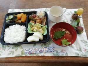メニューはカレーライス、マトン・ピーマン・ししとう・空芯菜、ちぢみ、味噌汁、梨等でした。