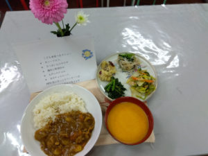 メニューはカレーライス、さつまいものサラダ、鶏肉と野菜炒め、もやしのナムル、カボチャのスープ、かき菜のゴマあえ等でした。